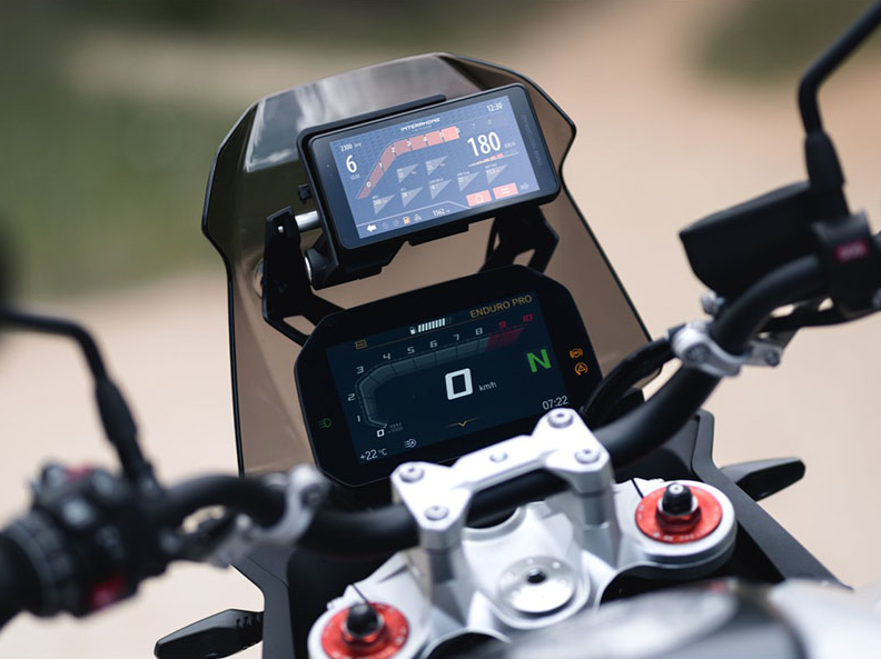 5,5″ ultra-fényes kijelző BMW motorokhoz, Apple CarPlay és Android Auto támogatással, valós idejű sebesség, hőmérséklet és fordulatszám kijelzés, könnyű plug & play telepítés a gyári GPS bölcsőbe, minden funkció a kormányon keresztül vezérelhető.
