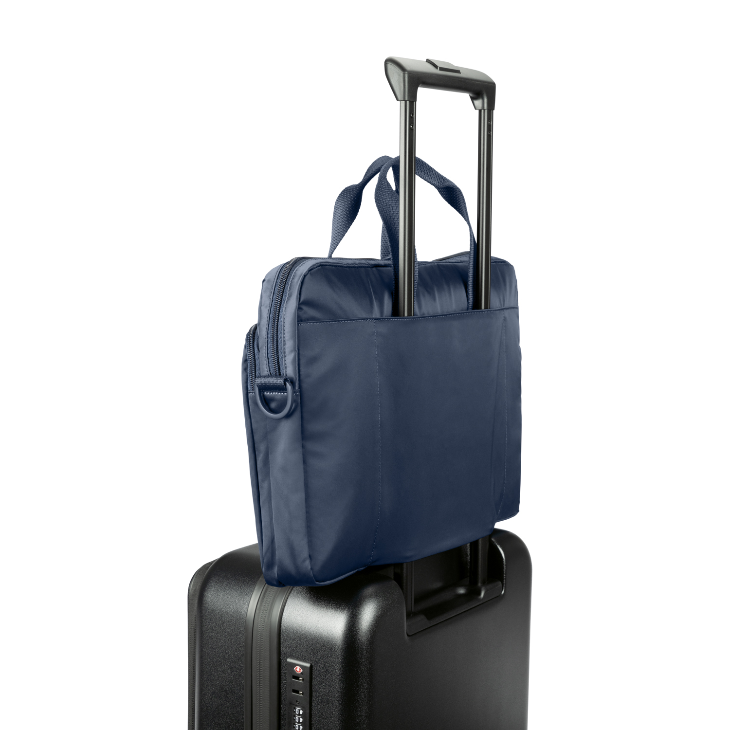 - Hátul nyitott zseb, alul cipzárral, amely egy kerekes bőröndre csúsztatható